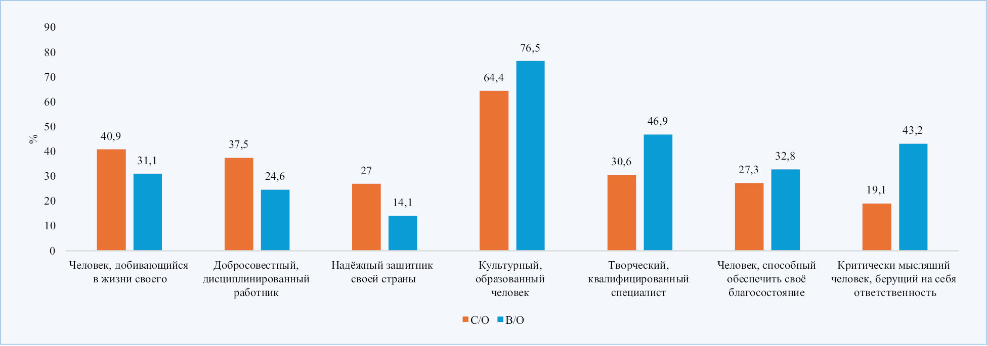 Рис. 1. Значимость личностных моделей выпускника школы среди родителей в зависимости от уровня их образования (%)