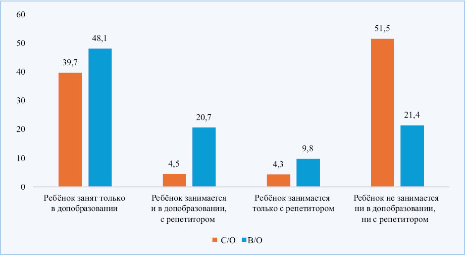 Анализ с учётом возрастной динамики показал, что с переходом ребёнка в старшие возрастные параллели школы снижается доля родителей, чьи дети занимаются только в системе дополнительного образования (с 51.9% — в начальной школе до 29.7% — в старшей). Параллельно увеличивается доля тех, чьи дети занимаются только с репетитором (с 4.8% до 17.8%). Заметим, что доля родителей, предоставляющих ребёнку возможность заниматься одновременно и в системе дополнительного образования, и с репетитором, с возрастом также увеличивается в два раза (с 10.4% до 21.8%).