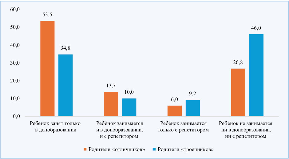 Из приведённых на рис. 3b данных видно, что родители «отличников» также предоставляют ребёнку больше дополнительных образовательных возможностей, по сравнению с теми, чьи дети имеют слабую академическую успеваемость. Это позволяет сделать вывод о том, что занятия в системе дополнительного образования в целом играют позитивную роль в учебной успешности ребёнка.
