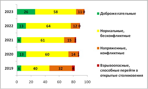 В 2019 г. более благоприятные оценки наблюдались в сельских населенных пунктах. В городах межэтнические отношения характеризовались сдержанно. Особенно тревожной на этом фоне в этот период выглядела ситуация в г. Якутске, где около трети опрошенных отмечали напряженность, а 4% даже взрывоопасность. В 2020 г. среди столичных жителей и сельчан очевиден рост позитивных оценок в сравнении с предыдущим годом. И эта положительная динамика продолжает наблюдаться в ответах жителей Якутска и в 2023 г., а у сельских жителей они стабильно держатся на уровне 2019 г. Примечательно, что в 2022 г., на фоне начавшейся СВО, жители оценивали доброжелательность межнациональных отношений в своем населенном пункте (независимо от его величины) в равной мере – на уровне 17%. В 2023 г. анализ ответов жителей разных по величине населённых пунктов свидетельствует о повышении доли доброжелательных характеристик межнациональных отношений на местах в Якутске и других городах республики до 25 и 29% соответственно.