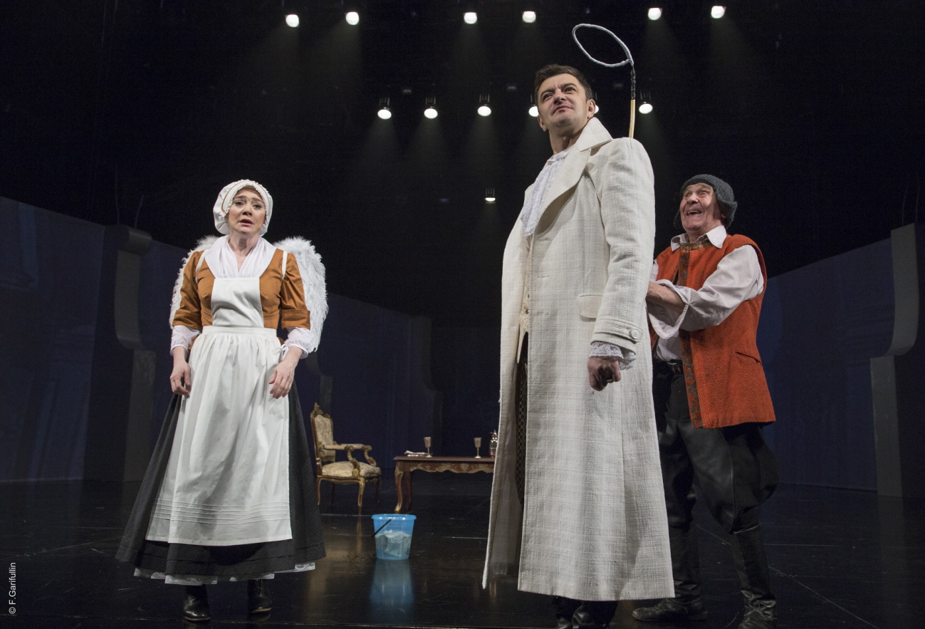 ТГАТ им. Г.Камала. «Дон Жуан» (2016, реж. Ф.Бикчантаев). Слева направо: Эльвира – Л.Хамитова, Дон Жуан – Р. Бариев, Гусман – Х.Залялов.