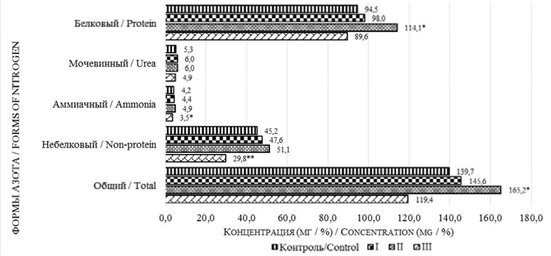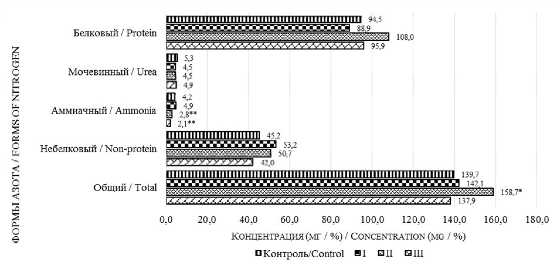 При этом количество небелкового азота, включая аммиачный и мочевинный, в I и II опытах достоверно не менялось, но снижалось при высоких дозах (III опыт).