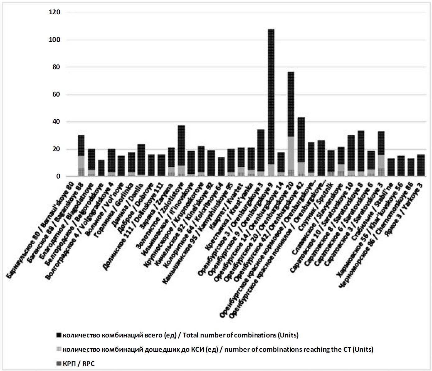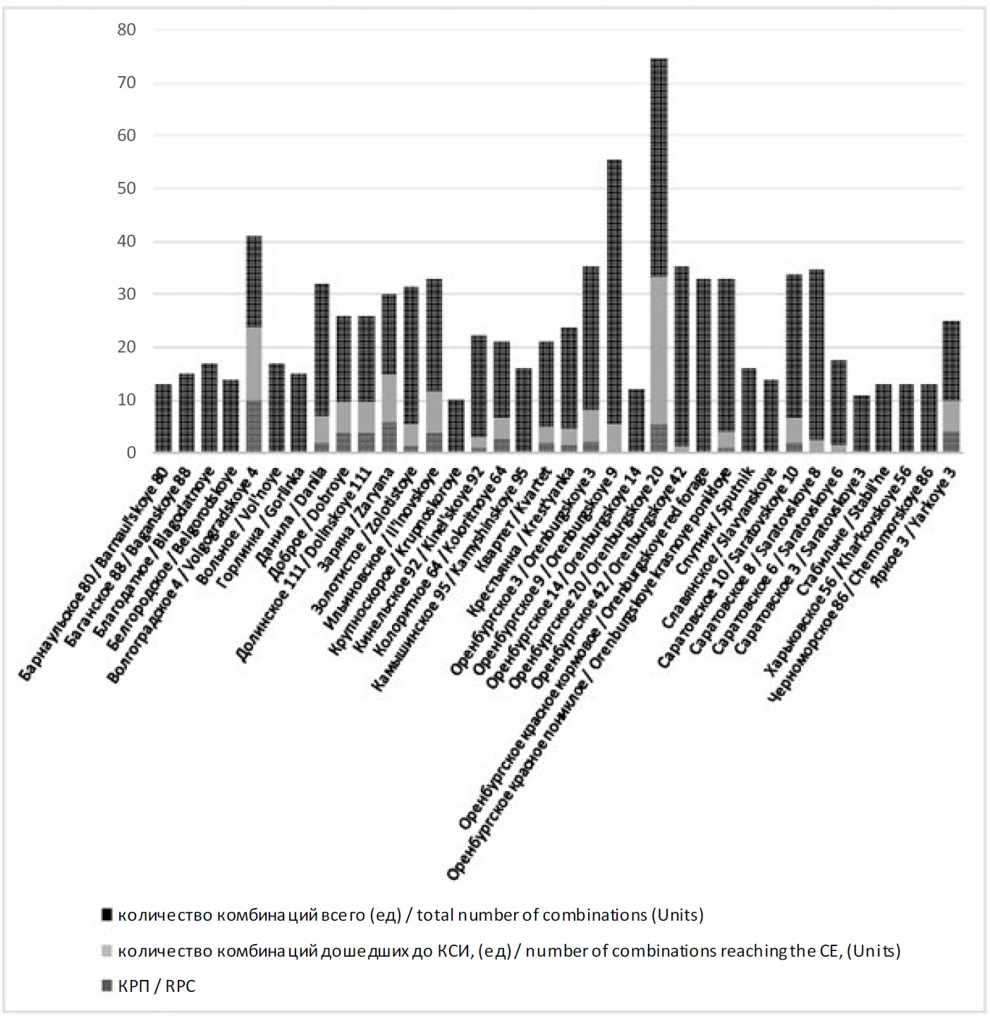 Коэффициент рекомбинационной способности рассчитывали по каждому сорту, как отношение количества созданных комбинаций к количеству сортообразцов дошедших до конкурсного сортоиспытания (формула 1).