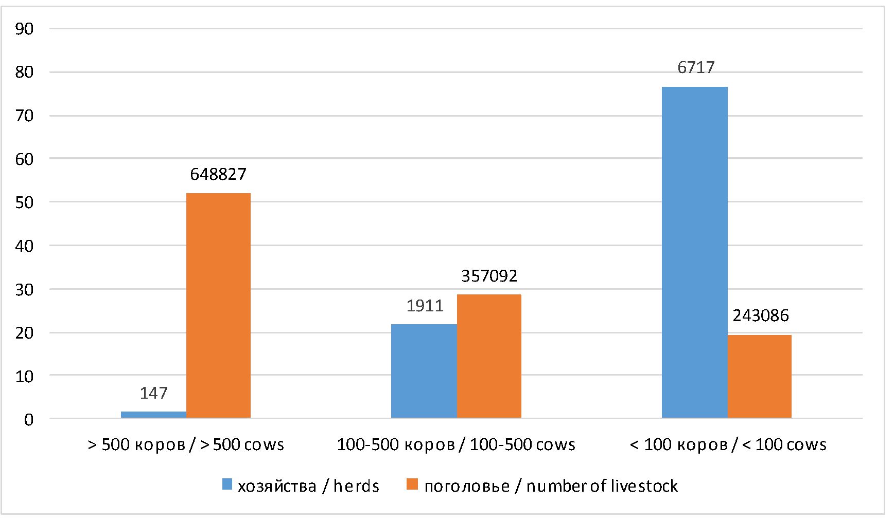 Среди всех хозяйств, ориентированных на разведение мясного скота, крупные предприятия с поголовьем более 500 коров составляют 147 единиц (рис. 3). При этом они располагают чуть менее 52 % общей численности животных, а доля средних и мелких хозяйств в структуре составляет 28,6 и 19,5 % соответственно.