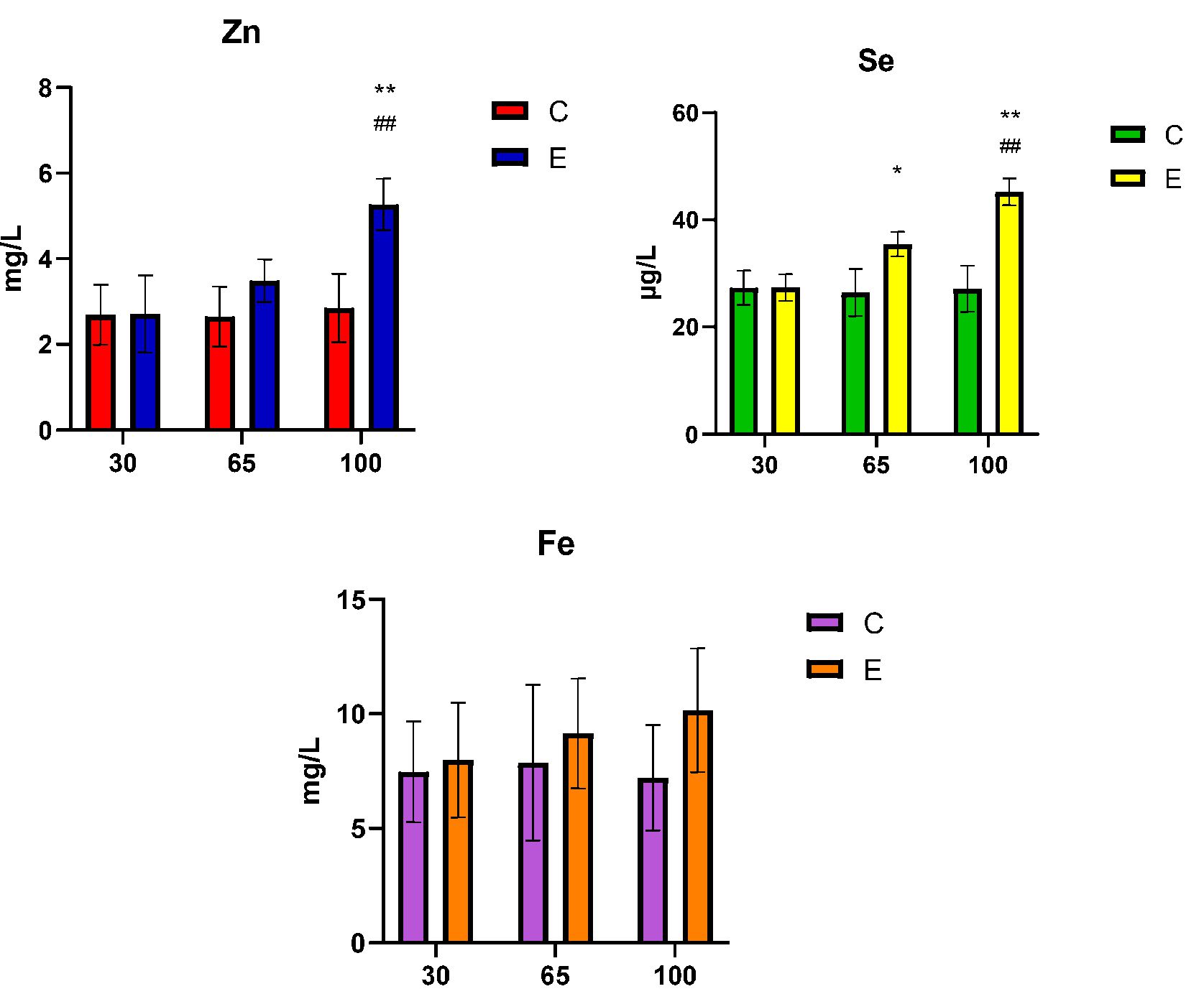 Как показано на рисунке 1, в нашем исследовании мы наблюдали, что содержание Zn в молоке было почти на одном уровне в начале периода доения (30-й день) в обеих группах (E/C: +0,74 %), но на следующих этапах лактации у коров, получавших хелатные минералы, концентрация Zn увеличилась не значительно (P≥0,05) на 65-й день лактации (E/C: +31,69 %) и значительно (P≤0,01) – на 100-й день лактации (E/C: +84,91 %). По сравнению с началом периода контрольного доения уровень Zn повышался в группе, получавшей хелатные минералы (E65/E30: +28,78 %, E100/E65: +51,01 %), причём высокозначимое (P≤0,01) увеличение наблюдалось на 100-й день по сравнению с 30-м днём (E100/E30: +94,46 %).