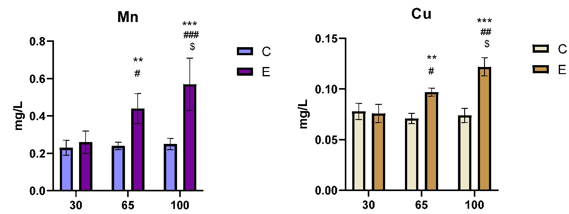 При анализе уровня Mn в молоке в начале эксперимента (30-й день) не выявлено значительных различий между группами (E/C: +13,04 %). В течение лактационного периода у коров опытной группы зафиксировано высокозначимое (P≤0,01) увеличение содержания Mn на 65-й день лактации (E/C: +83,33 %) и на 100-й день лактации (E/C: +128,00 %). По сравнению с началом периода контрольного доения уровень Mn повышался (E65/E30: +69,23 %, E100/E65: +29,54 %) в группе, получавшей хелатные минералы, а к 100-му дню по сравнению с 30-м установлено высокодостоверное (P≤0,01) увеличение (E100/E30: +119,23 %).