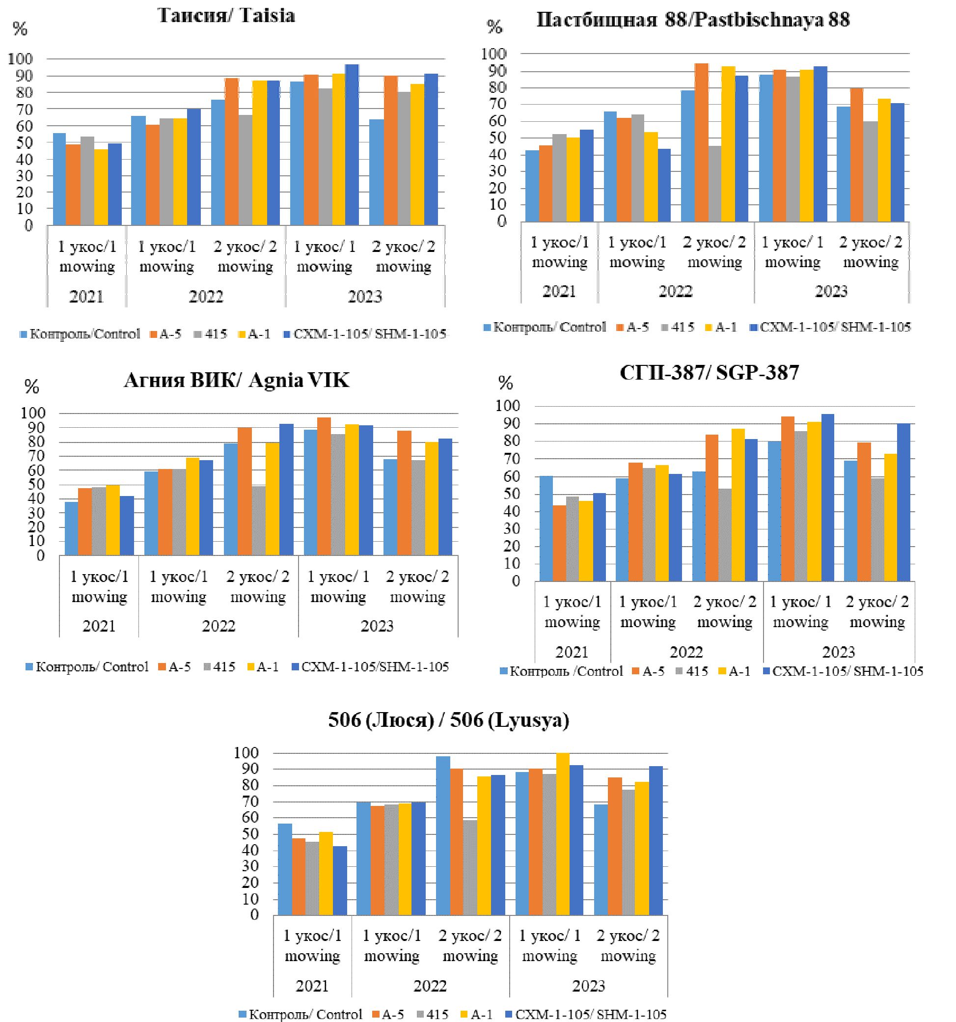 Поздняя уборка трав в 2022 году повлияла на отрастание и дальнейшее развитие травостоев третьего года жизни растений в 2023 году. Вариация количества побегов составила от 348 шт./м2 (сорто-микробная система сорт Пастбищная 88+производственный штамм 415) до 1352 шт./м2 (сортообразец 506 (сорт Люся)+штамм А-5). Как и в 2022 г. побегообразовательная способность сортообразца 506 (сорт Люся) при обработке штаммом А-1 отставал по количеству побегов по сравнению с вариантом при обработке штаммом А-5.