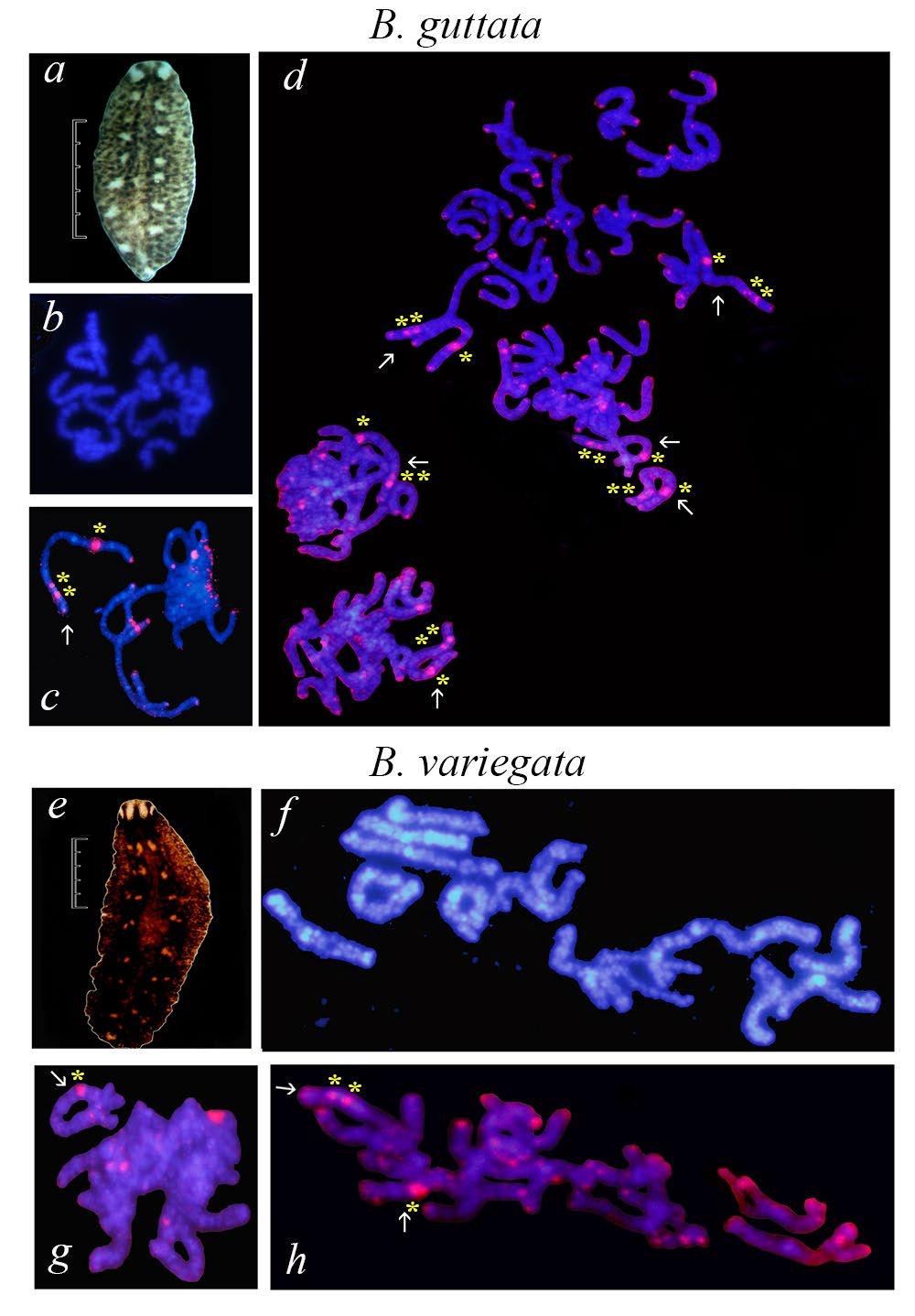 Fig.1. Telomere signals (pink) in meiotic chromosomes of Baikal planarians (chromosomes stained with DAPI, blue): a, e – appearance of worms, the scale is 1 cm; b, f – 15 pairs of chromosomes; c, d, g, h – FISH shows telomeric repeats TTAGGG in B. guttata and B. variegata. Arrows point at chromosomes with ITS. Yellow asterisks indicate ITS. A number of chromosome sets is shown in figure d.
