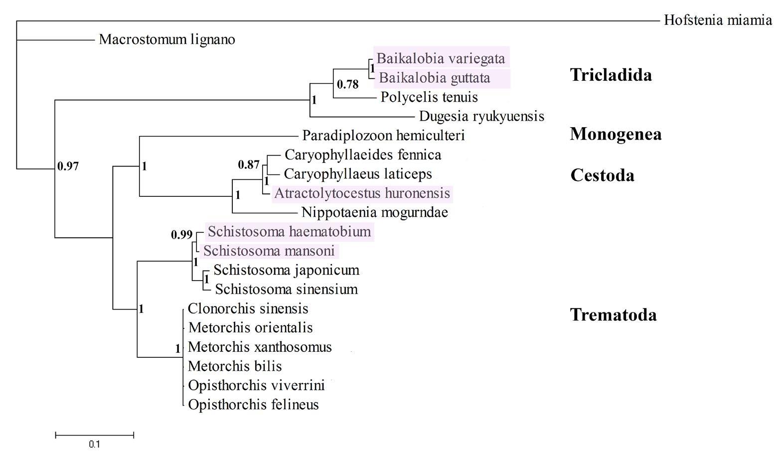 Fig.2. 18S rRNA gene phylogenetic tree (MrBayes 3.2.7). Species with ITSs are highlighted in pink. On the right are the flatworm order names. The nodes indicate the posterior probability values. The scale shows genetic distances.