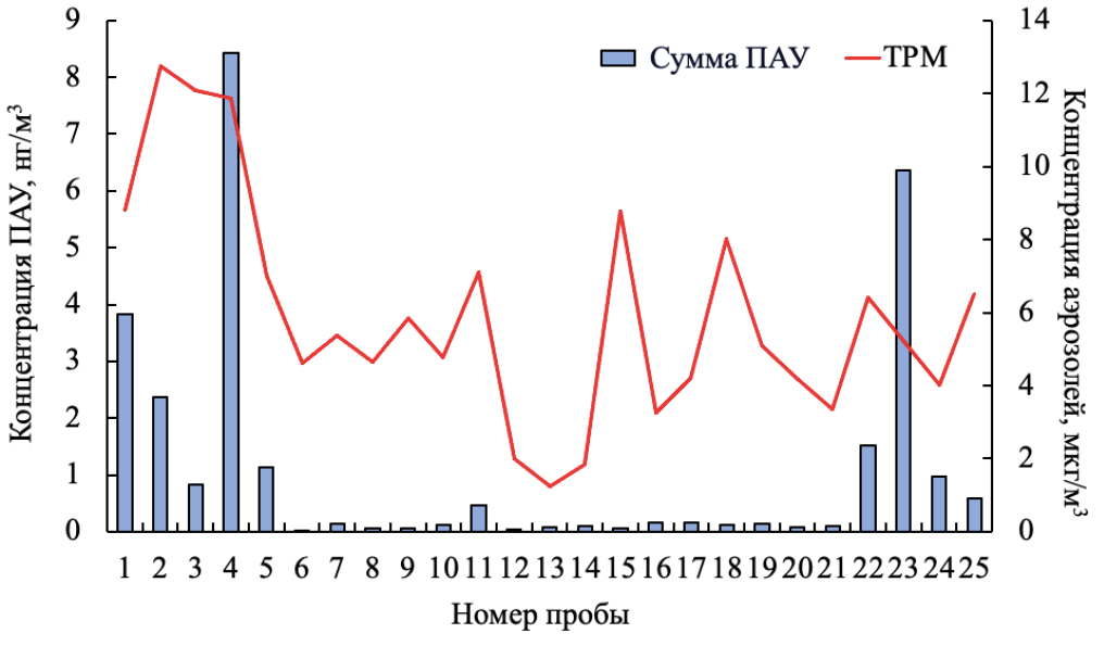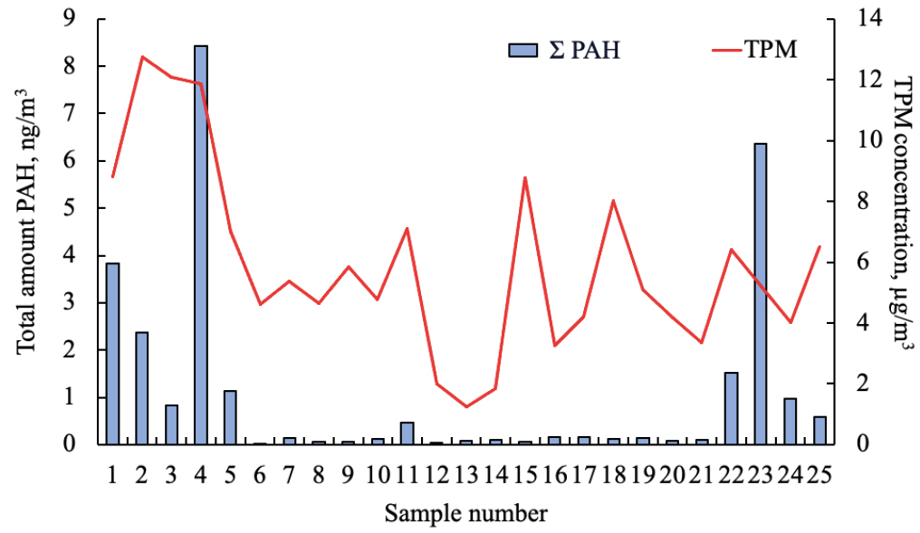 3. Fig.2. ТРМ (µg/m3) averaged for each sample and the total amount of 21 PAHs (ng/m3) in the air above the water area of Lake Baikal (5–15 August 2023).