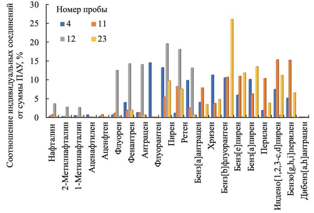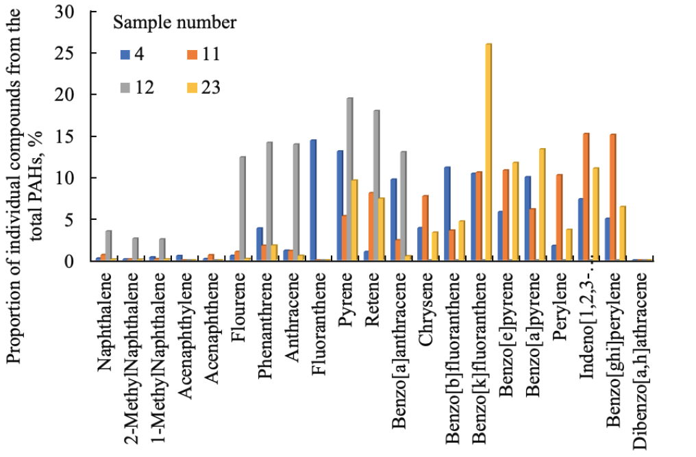 5. Fig.4. Proportion (%) of individual compounds from the total PAH concentration in aerosol samples 4, 11,12, and 23 above the surface of Lake Baikal (5–15 August 2023).