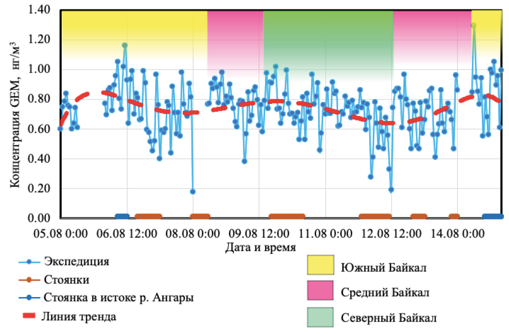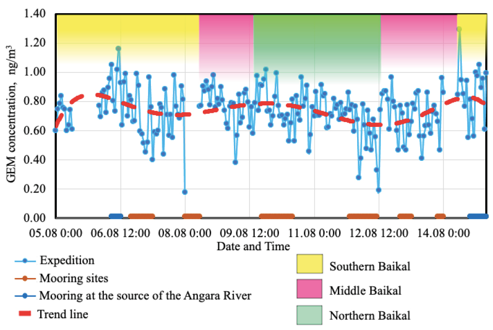 6. Fig.5. Variability of the GEM concentrations (ng/m3) in the air above the water surface in the southern, central and northern basins of Lake Baikal (5–15 August 2023).