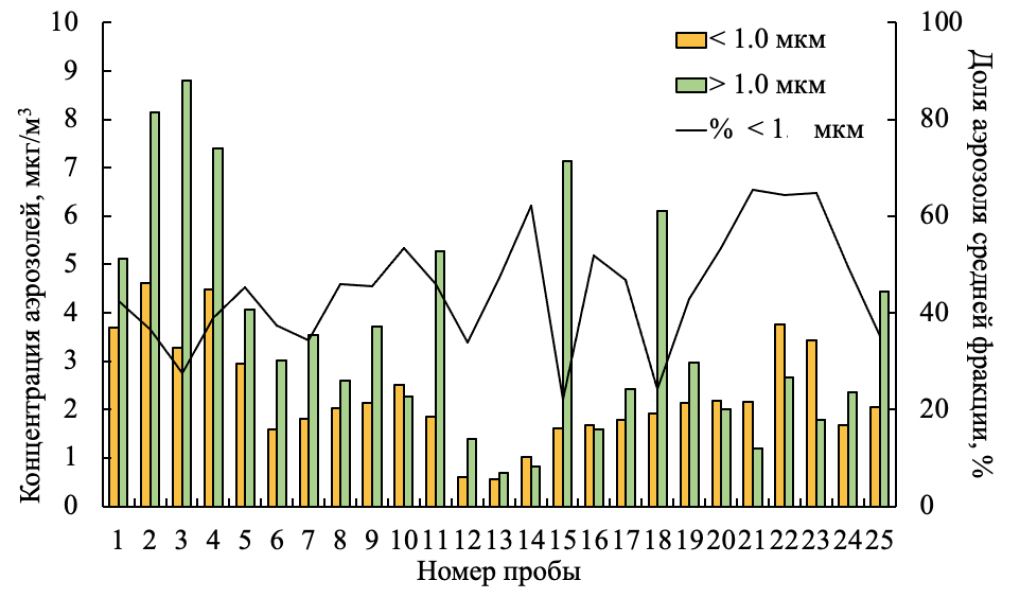 The dynamics of the number concentration of aerosol particles showed the changes both in the medium aerosol fraction with a size of up to 1.0 µm and in a coarse fraction of up to 10 µm. During the expedition, there were several episodes of an increase in the concentration of medium fraction particles (PM1 < 1 µm). On the route, the medium fraction (PM1 < 1 µm) was 62% (Fig. 3, sample 14) at the background site along the east coast (the middle of the route from Ayaya Bay to Lokhmaty Island). At the estuary of the Kharauz River, during the transition from the east coast of the west coast (the Kharauz estuary–Bolshoye Goloustnoye), the concentration of the medium fraction reached 65% (samples 21-23) due to the cyclone above Lake Baikal during that period. As we approached local sources of air pollution in the southern basin, the number of the medium aerosol fraction decreased dramatically from 43% to 27% (samples 2-3) and down to 24% in the central basin near the Ust-Barguzin settlement (Fig. 3, sample 15).