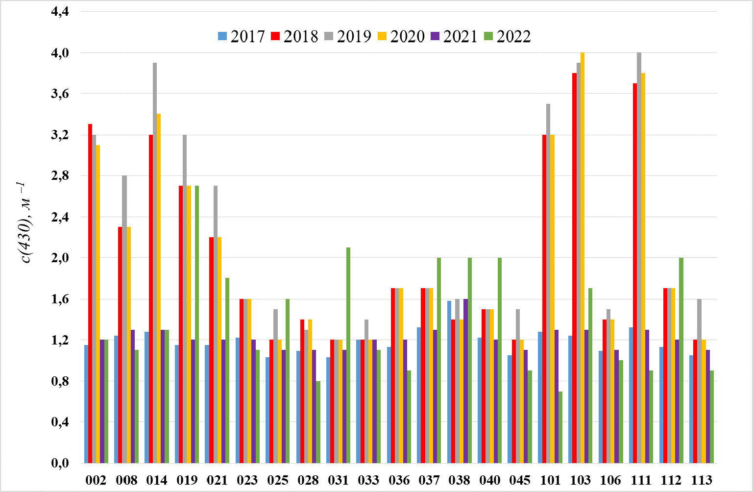 Over a 6-year period of optical investigations, indicators of light absorption by yellow substance ays(λ) at wavelengths λ= 430, 450, 550 and 670 nm in the surface layer showed minor fluctuations (0.1‒3.2 m‒1) Maximum values (above 2.0 m‒1) were recorded in 2018–2020 on rivers Chulyshman, Chulyush and Kyga, including Cape Syraktu. As an example, Fig. 2 and 3 represent the dynamics of с(430) and ays(450), respectively.