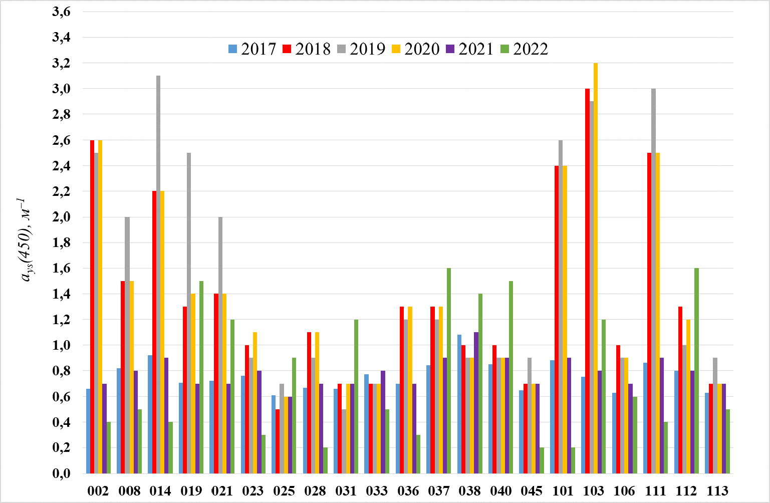Here, Сys is the concentration of YS, in g/m3, asp.ys(450) is the specific indicator of light absorption by YS (m2/g). Taking into account the approach proposed in (Mankovsky, 2015), we calculated Сys using the value asp.ys(450) from (Nyquist, 1979).