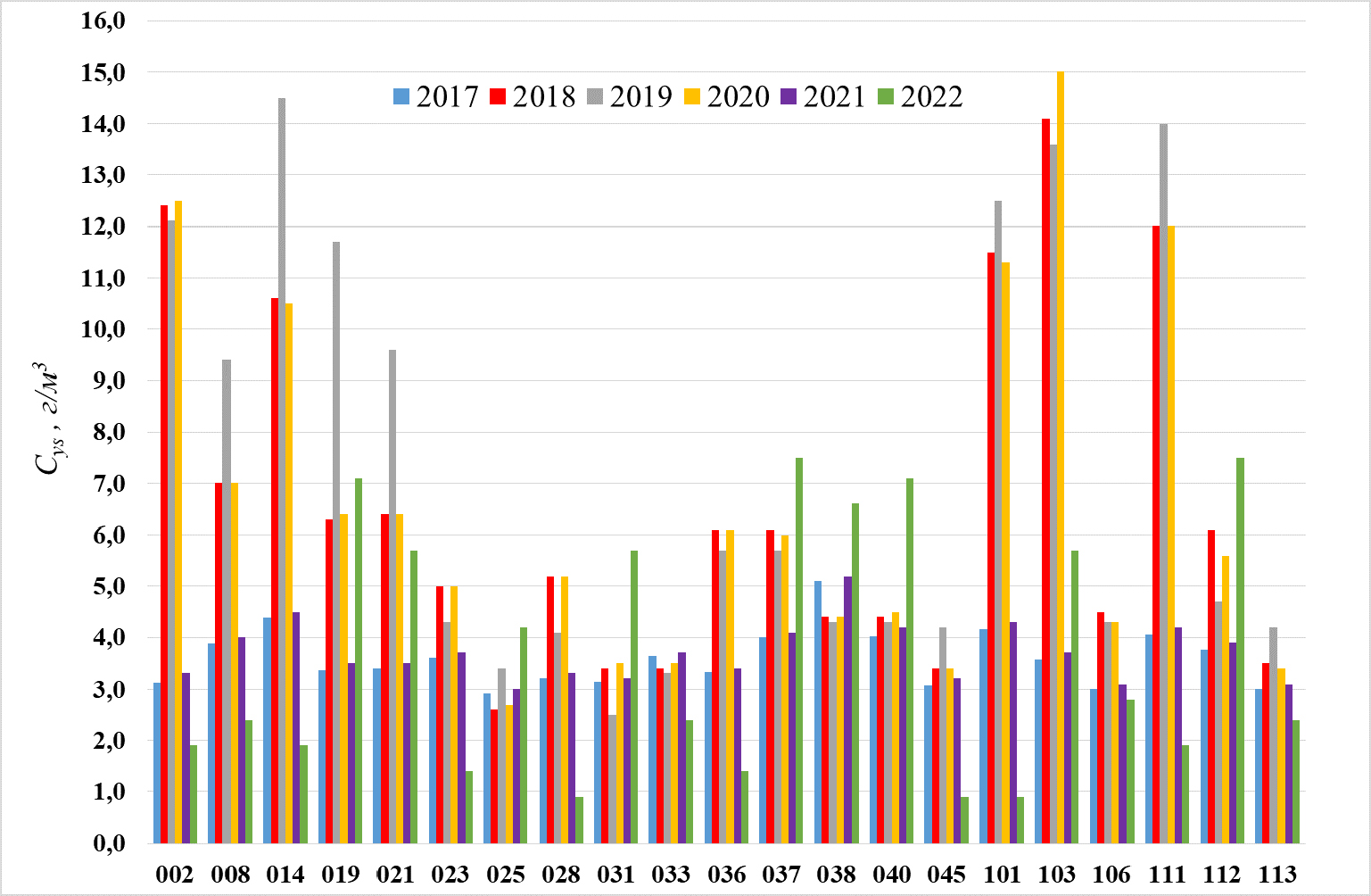In 2017–2022, concentrations of yellow substance Cys in the surface layer of the lake varied greatly, i.e. from 0.9 to 15.0 g/m3 (average: 8.0 g/m3) (Fig. 5). For the last two years of our investigations, it decreased (0.9–7.1 g/m3) and reached the indicators of 2017 (2.9–5.1 g/m3).