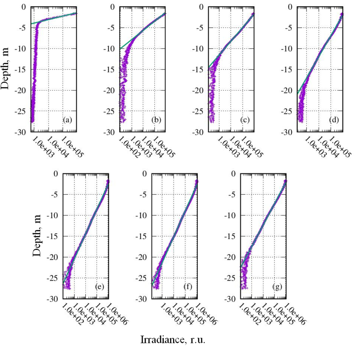 Рис.2. Пример измерения профилей горизонтальной облученности на ст. 002 в семи спектральных каналах с центральной длиной волны: 380 нм (a), 443 нм (b), 490 нм (c), 510 нм (d), 555 нм (e), 590 нм (f) и 620 нм (g). Прямая линия – результат аппроксимации уравнением 4 для соответствующего спектрального канала.
