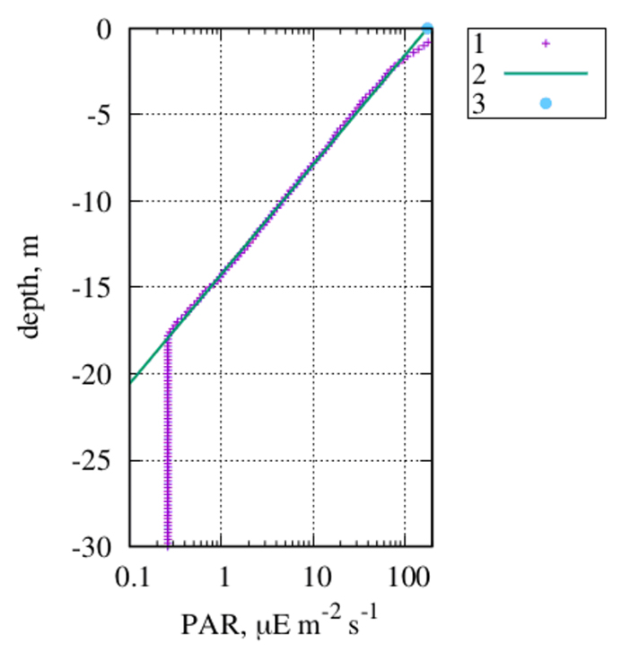Kd считали не зависящим от z, и определяли его по измерениям ФАР(z) для участка чуть ниже поверхности (z > 2–3 м), чтобы избежать влияния тени судна. Измерения проводились в течение нескольких минут, чтобы минимизировать ошибки, связанные с переменным освещением поверхности воды, например, облачностью. Определив коэффициент a, находим фотосинтетически активную радиацию сразу под поверхностью воды ФАР(0-). На Рис. 3 точкой показан пример расчёта для ст. 002.