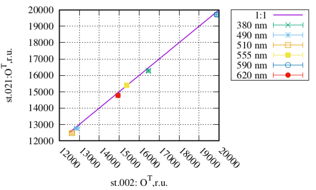 Для проверки гипотезы стабильности «темнового» телеметрического сигнала горизонтальной облученности для семи спектральных каналов использованы измерения на ст. 002 и 021. Разность измерений на этих станциях по времени составила 2 дня. Результаты представлены на Рис. 4 и Таблице 1. В Таблице 1 даны среднее значение , их среднеквадратичное отклонение (СКО) и число измерений N. Из Рис. 4 видно, что калибровки стабильны.