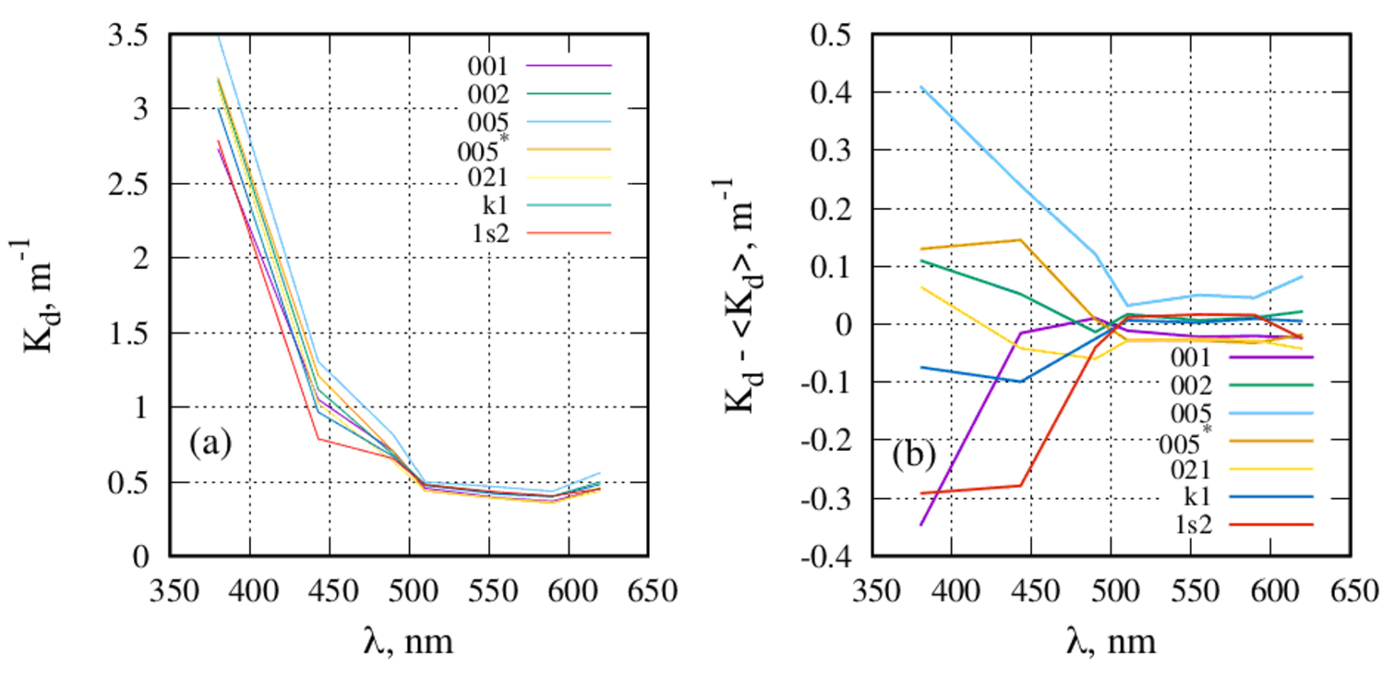 Для выявления географических особенностей Kd рассмотрим Рис. 5b. Значения разности выше среднего в коротковолновой области спектра наблюдаются на юге озера (ст. 002, 005 и 005*); минимальные значения – на севере озера (ст. 001 и 1s2); промежуточные значения в центре (ст. k1 и 021). Таким образом, в верхнем слое озера наблюдается тенденция уменьшения поглощения водой (главным образом связанная с концентрацией растворённой органики, т. к. речь идёт о спектральном канале с центральной длиной волны 380 нм) с юга на север.