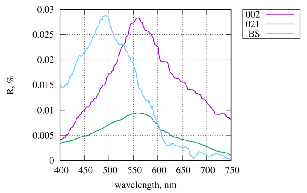Рис.6. Примеры измерений коэффициента яркости водной толщи в Телецком озере в августе 2023 года на ст. 002 и 021 и в глубоководной части Черного моря в апреле 2021 года.