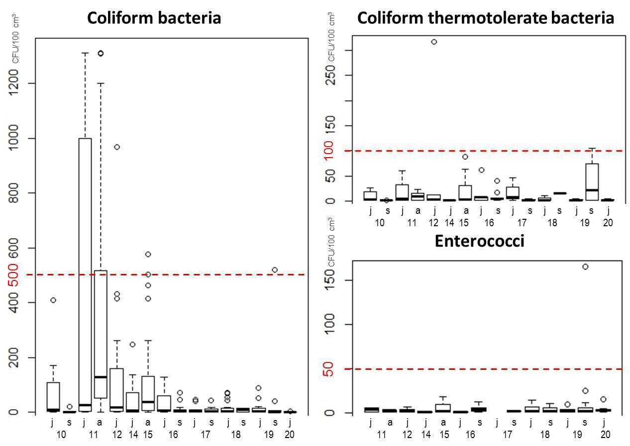Fig.1. Abundance of sanitary-microbiological indicators in the pelagial water zone of Lake Baikal in 2010-2020 data (j-June, a-August and s-September). Red color –the standards.