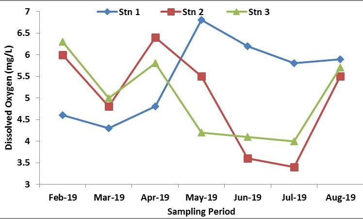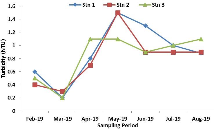 Sampling for water parameters was carried out at the three stations at monthly intervals between February and August 2019. The sampling period covered dry season, onset of rain and peak of rainy season. The collected water samples were taken with sterile one (1 litre) plastic containers. The containers were rinsed three times with the water samples to be collected at the site before collection was made.