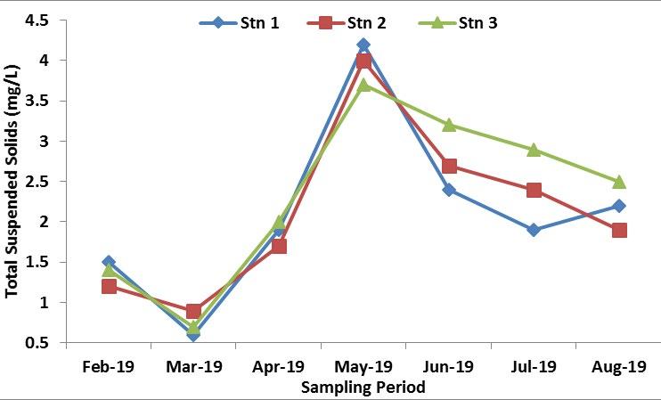 Total suspended solids value is normally used as a potential index for drinking water contamination. The higher the TSS values, the higher likelihood of introduction of different diseases in the water body, which affect all living organisms, especially humans. Results of TSS obtained in the present study were lower than in the study of Amah-Jerry et al. (2017) on the Aba River, Southeast Nigeria. Similarly, the study of Danha et al. (2014) at discharging point and downstream of charging point recorded higher values than the present study. The higher TSS values obtained in the river between April and August could be attributed to high runoff as result of early rains that emptied debris and other suspended materials into the river.