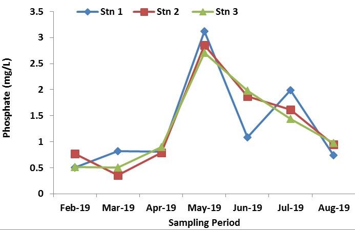 NO3- values in natural surface waters are often less than 1 mg/L, but a water body under the influence of anthropogenic activities could have NO3- values up to 5 mg/L (Anyanwu and Ukaegbu, 2019). NO3- values above of 5 mg/L usually indicate anthropogenic activities or animal waste, or fertilizer pollution. The NO3- values in this study were within the values of natural river (< 1 mg/L), except for May when the values exceeded 1mg/L. The spatial and temporal variations recorded may be attributed to the application of nitrogen containing fertilizers and run-off. The NO3- values observed in the present study were low compared to results of some studies in Nigerian rivers (Igbinosa et al., 2012; Yusuf et al., 2017; Amah-Jerry et al., 2017; Anyanwu and Emeka, 2019). However, NO3- values recorded during this study were within or little below the results of Anyanwu and Ukaegbu (2019) and Kindele and Olutona (2014), both obtained in Nigeria.