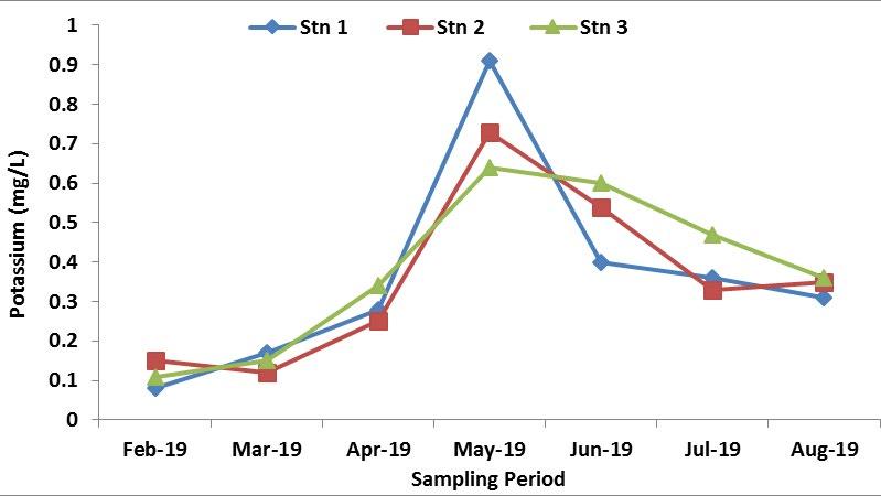 The spatial and temporal variations of K+ are shown in figure 15. The values ranged from 0.08 to 0.91 mg/L (Table 2). The lowest and highest values were recorded at Station 1 in February and May 2019, respectively. All K+ values were lower than the acceptable limit of 50 set by FMEnv (2011). There was no significant difference (P > 0.05) in the K values across all stations.