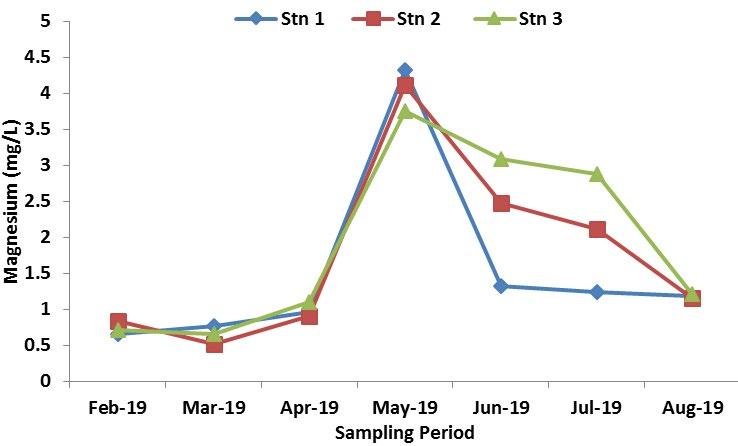The concentrations of Mg2+ ranged between 0.51 and 4.32 mg/L. The highest concentration of Mg2+ was recorded in May 2019 across the three stations, whereas the lowest concentration was recorded at Station 1 in February 2019, though Stations 2 and 3 recorded their lowest concentrations in March 2019. No significant difference (P > 0.05) was recorded among the stations. The spatial variation of Mg2+ concentration followed the same trend as Ca2+. At Station 1, there were gradual increments between February and May, then there was a monthly decreased throughout the study period. At the same time, at Station 2 and Station 3, the trend revealed a decrease between February and March followed by a gradual increase between March and April, then there was a drastic increase in May (onset of rain) and afterwards a monthly decrease throughout the study period (Fig. 17).