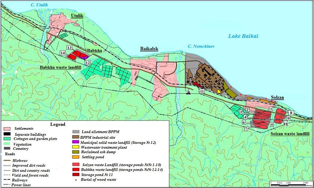 The objects of the study were industrial waste, bottom sediments and soils in the area of BPPM location. Pulp and paper industry enterprises accumulate a large amount of industrial waste that is buried in special storage ponds. Waste from extensive wood processing is distinguished by its complex chemical composition and includes substances of varying degrees of toxicity and hazard. Two landfills with a total area of more than 150 hectares are used to store waste accumulated during the BPPM operation. The storage ponds located in a seismic and mudflow risk zone contain over 6.2 million tons of production waste. The Solzan sludge storage site (storage ponds No. 1 to 10) with an area of about 119 hectares is located on the slope of the Hamar-Daban foothills in the interfluve of the Malaya Osinovka and Solzan rivers 5 km southeast of the BPPM industrial site. The Babkha site (storage ponds No. 12 to 14) is located 8 km northwest of the BPPM industrial site between the Babkha and Utulik rivers. Intermediate storage pond No. 11 is located at the BPPM industrial site. The bulk of the waste is colloidal sludge lignin precipitates formed during biological and physicochemical wastewater treatment, ash from sludge lignin combustion, ash and slag from coal combustion, and ash from bark boilers (Kolotov et al., 2021). In the course of the study, 13 waste samples were taken from the storage ponds. Figure 1 shows the layout of the storage ponds at the waste storage sites. The layout of storage ponds at the waste landfills is shown in Figure 1.