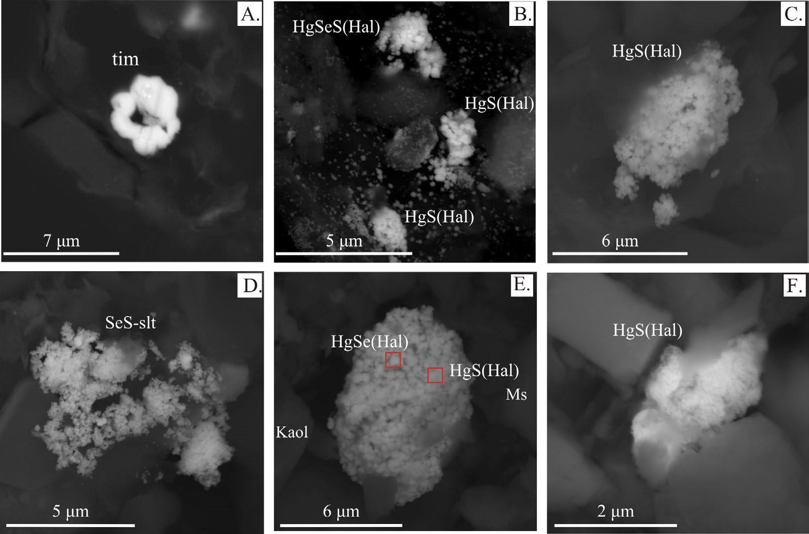 Fig.1. SEM images (BSE) of secondary Hg minerals in NOM from the dispersion halo of the Ursk tailings dump (A and B), in the snow suspended matter near AMME (C and D), in the suspended matter of temporary fluxes formed during snowmelt near the AMME mines (E), and in the suspended matter of the Yarly-Amry River sampled at a 1.4 km distance from AMME (F): А – cross section of the timmanite tube (tim); B – accumulation of globular and nodular Hg sulfide particles with Cu, Ag, I, and Сl (HgS(Hal)) in contact with Se-containing phases (HgSeS(Hal)); С – nodular aggregation of Hg sulfides containing Se, I and Cl admixtures; D – flocculated segregations of I-containing Hg seleno- and sulfosalts in muscovite; E – aggregations of Hg sulfide and selenide particles with Ni, Cu and Br admixtures; F – fine-grained aggregations of Hg sulfides with Ni, Cu and I admixtures.