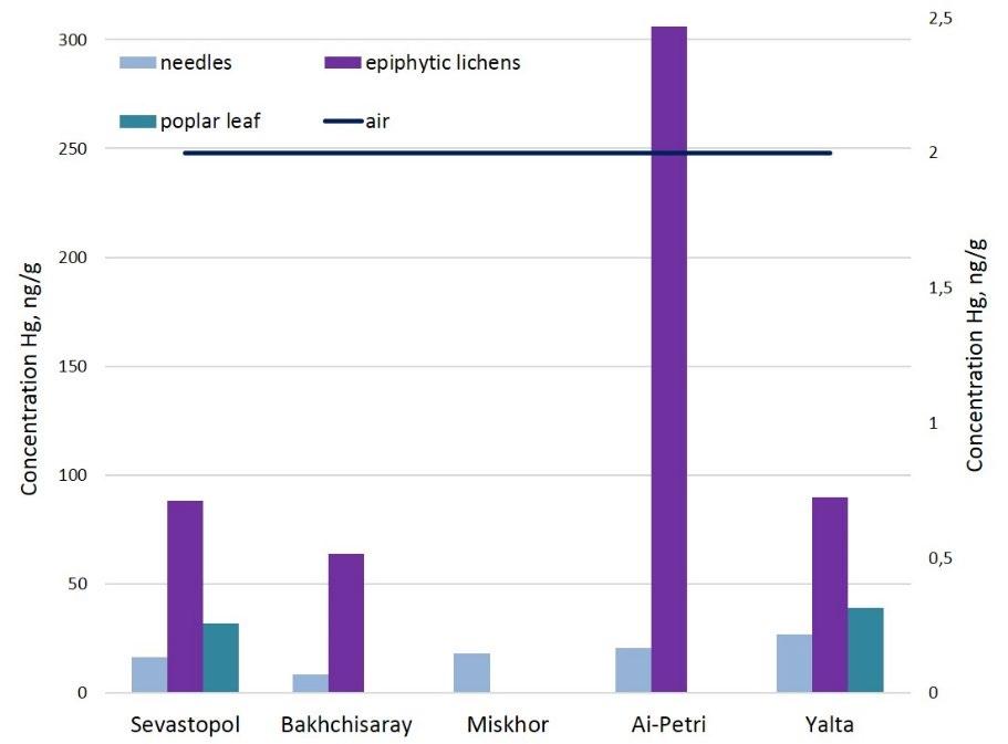The obtained Hg concentrations in the coniferous trees on South Coast were significantly lower than the literature data on other bioindicators of the condition of the atmospheric air: epiphytic lichen species and poplar leaves (Evstafieva et al., 2021). The mean mercury concentration in lichens was from 3 to 15 times higher, and in poplar leaves - from 1.5 to 2 times higher (Fig.). It is preferable to compare the Hg concentrations in needles with data on poplar leaves, as they reflect the level of mercury impact on the atmosphere of the region in one season, while lichens show the long-term input of the element. At the same time, the mean mercury concentration in the air of the Republic of Crimea was 2 ng/m3; background concentrations in soils - 8-3000 ng/g; bedrock - 12-10000 ng/g and sea water - 3-680 ng/g.