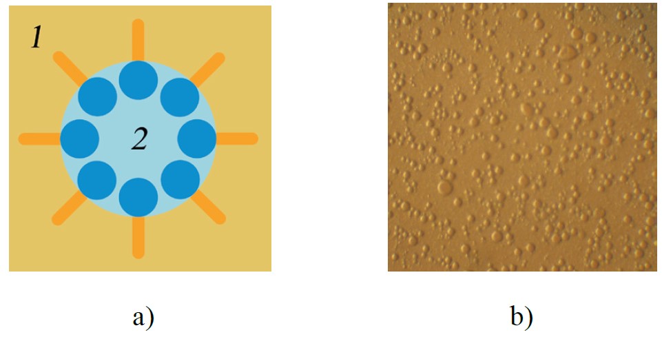 Fig. 1. а) schematic image; b) microscopic view of a mixed methanol-containing fuel at 100x magnification