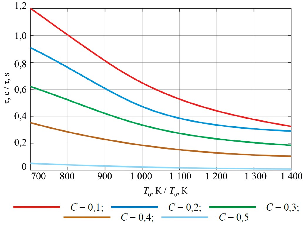 Учитывая влияние на динамику испарения периода пульсаций таких параметров, как дисперсность и размер капель, концентрация воды в составе эмульсии, процесс испарения перед воспламенением капли ВТЭ выглядит весьма непросто [31–33]. Вместе с тем пульсирующее поведение капли ВТЭ при испарении вызывает у ученых наибольший интерес, поскольку при решении задач моделирования необходимо учитывать достаточно медленный процесс накопления в объеме капли пара, что в свою очередь требует рассмотрения задачи в квазистационарной постановке. Основной целью при выполнении вычислений является изучение изменения температурных характеристик капли, воды и пара в динамике, а характеристики периода пульсации от концентрации воды в эмульсии (рис. 2), температуры среды (рис. 3), начального размера капли (рис. 4) и размеров глобул воды (рис. 5) можно определить с помощью численного моделирования релаксационных колебаний поверхности капли ВТЭ [31].