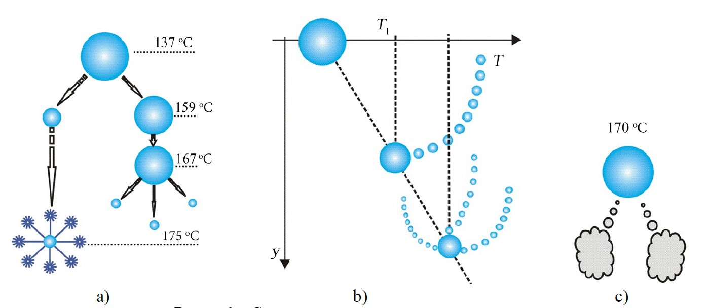 a) капля распадается на два фрагмента, каждый из которых впоследствии дробится на более мелкие, либо взрывается, переходя в парообразное состояние;