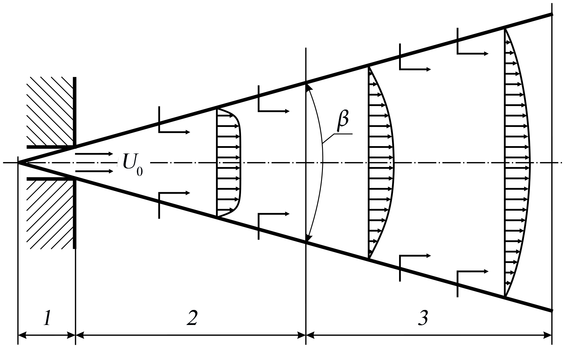 Развиваясь, топливный факел условно может проходить три участка (рис. 7) закономерности распада и движения струи: сплошной, начальный и основной. Сплошной участок характеризуется скоростью истечения жидкости из сопла. При работе на ДТ его длина составляет доли мм, поскольку практически сразу после выхода струи из сопла начинается ее распад. Следовательно, при работе на МСТ учет этого участка не изменит общую картину закономерностей развития факела, поэтому им можно пренебречь. Рассматривая закономерности начального и основного участков развития факела, позволим себе опереться на исследования А. С. Лышевского и Н. Ф. Разлейцева 2, в которых авторы, руководствуясь свойствами затопленной струи несжимаемой жидкости и большой концентрацией капель на начальном участке, сделали предположение об объемном развитии факела на начальном участке и струйном – на основном (рис. 7).