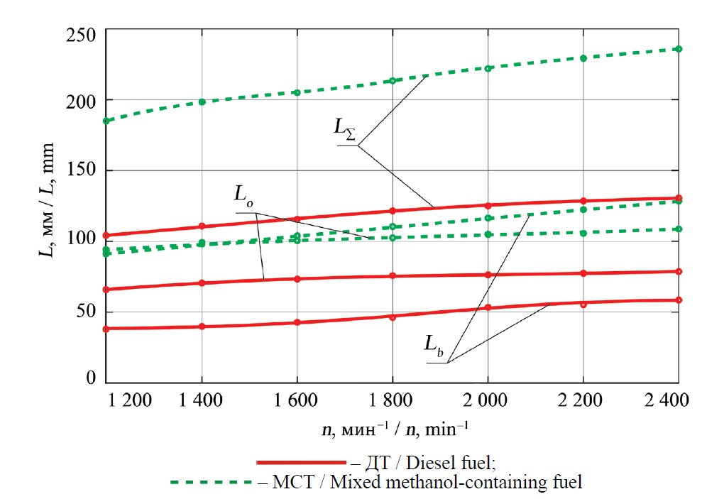 Materials and Methods. There are considered the characteristics of injecting and spraying alcohol-containing fuel in a diesel engine modified to operate on a mixed methanol-containing fuel. There were used the well-known A.S. Lyshevsky dependencies, which fairly reliably reflect the processes of injecting and spraying in diesel engines.