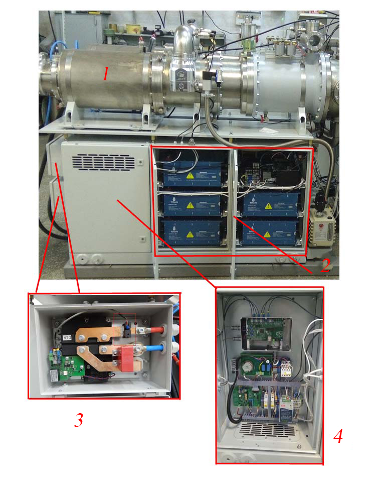Fig. 2. Appearance of magnetic system with its power supply: 1 – magnetic system; 2 – supercapacitor storage; 3 – current regulators; 4 – controller with parts of charging and discharging circuit