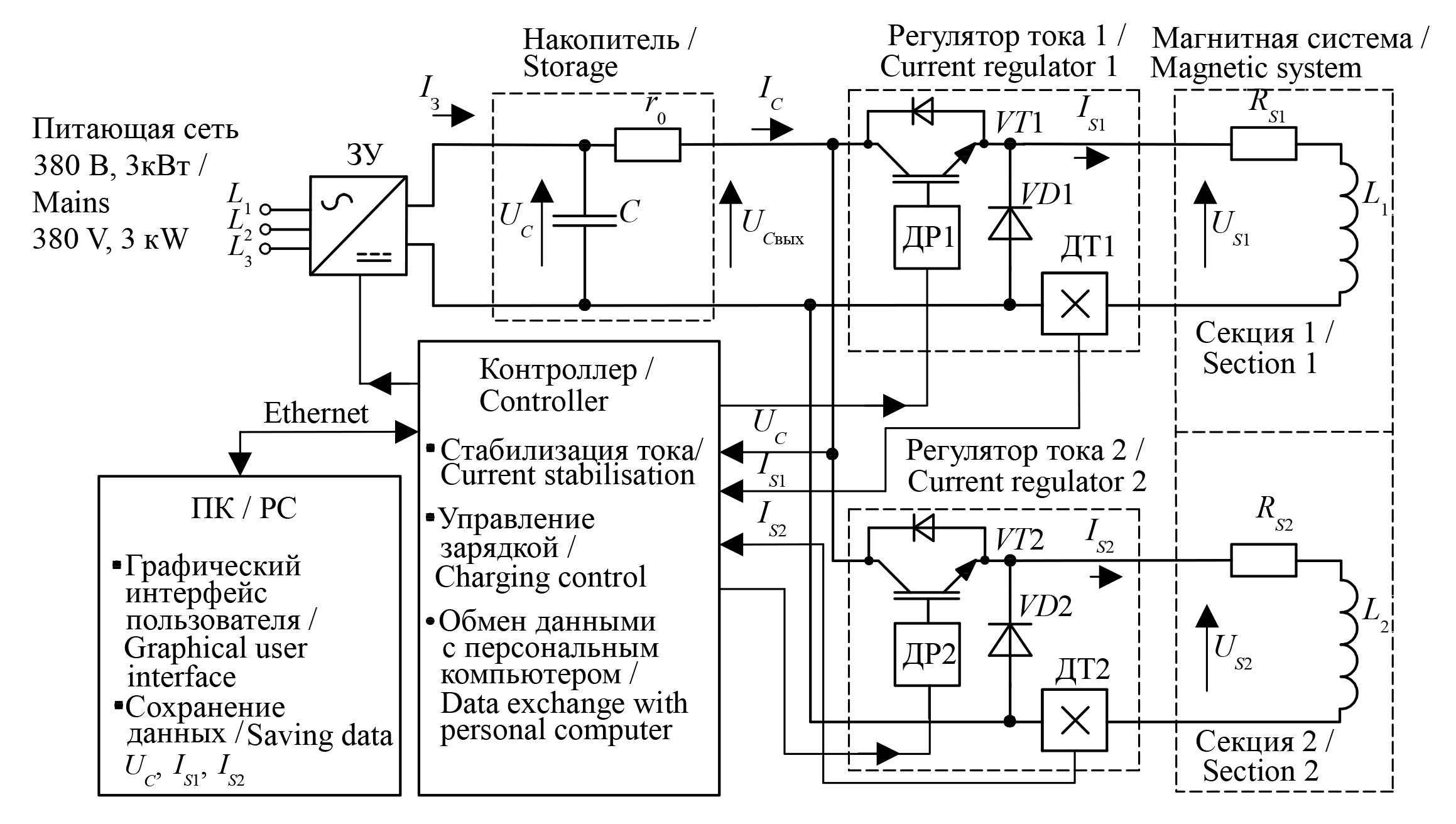 Note: ЗУ – charging device; ДР – driver of IGBT switching module; ДТ – current sensor; ПК – personal computer.
