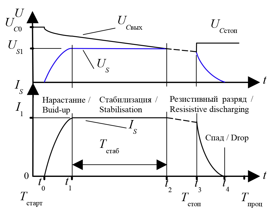 Накопитель электрической энергии емкостью С и внутренним сопротивлением r0 предварительно заряжается до напряжения UC0, в несколько раз превышающего эффективное напряжение US1 и US2 каждой секции магнитной системы. В момент времени Тстарт включаются регуляторы тока, токи в обмотках магнитной системы начинают нарастать (интервал t0–t1 на рисунке 5) до заданных значений I1 и I2, после чего выполняется их стабилизация по мере разряда накопителя. Стабилизация тока (интервал t1–t2 на рисунке 5) возможна до тех пор, пока выходное напряжение накопителя превышает эффективное постоянное напряжение US1 и US2 каждой секции, после чего начинается резистивный разряд накопителя на их активное сопротивление (интервал t2–t3 на рисунке 5). В момент времени Тстоп выключаются регуляторы, и ток в обмотках экспоненциально спадает через диод VD (интервал t3–t4 на рисунке 5).