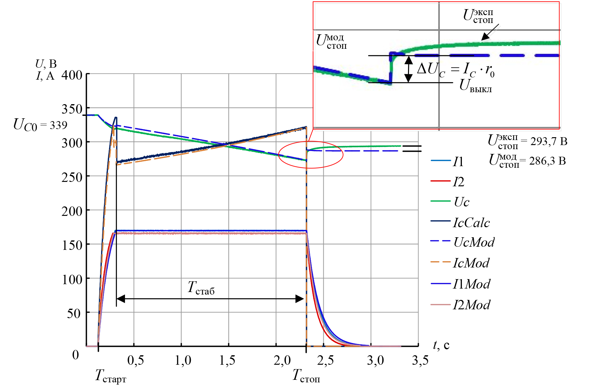 Рис. 7. Форма выходного тока и напряжения накопителя по результатам эксперимента и моделирования: I1, I2, Uc – экспериментальные формы тока и напряжения; IcCalc – расчетный выходной ток накопителя; UcMod, IcMod, I1Mod, I2Mod – результаты моделирования