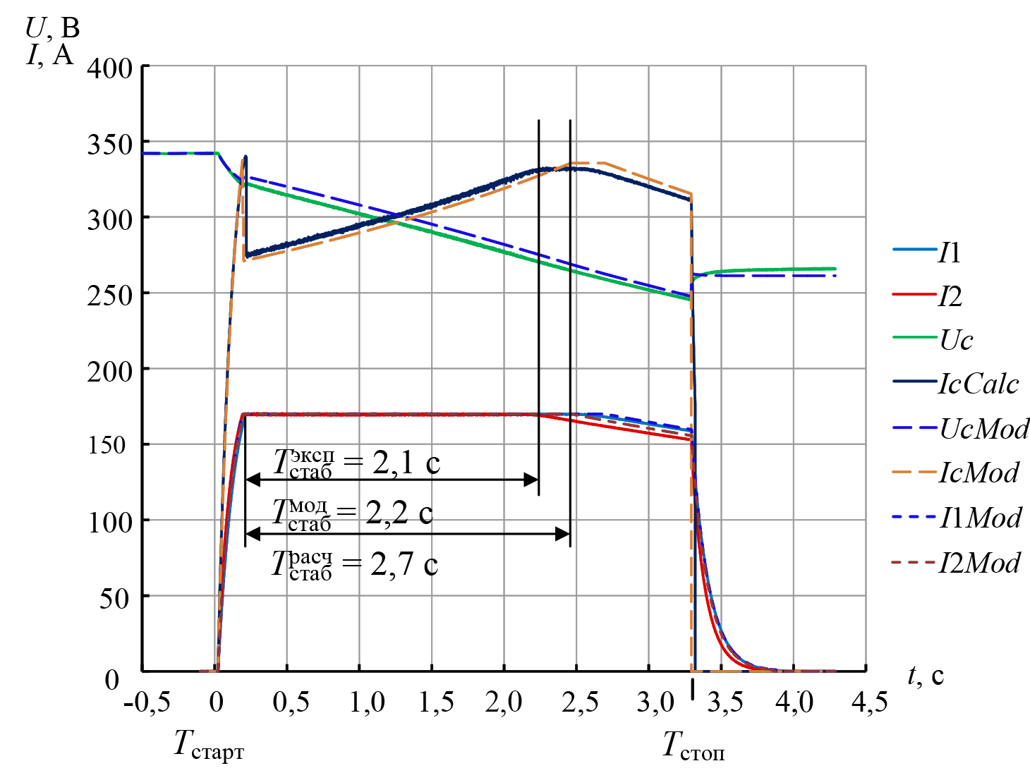 При определении этого коэффициента потребление энергии ведется до тех пор, пока возможна стабилизация тока в обоих каналах. В момент времени Тстоп или после прекращения стабилизации тока хотя бы в одной секции выключаются регуляторы тока, определяется длительность его стабилизации Tстаб = t2 – t1.