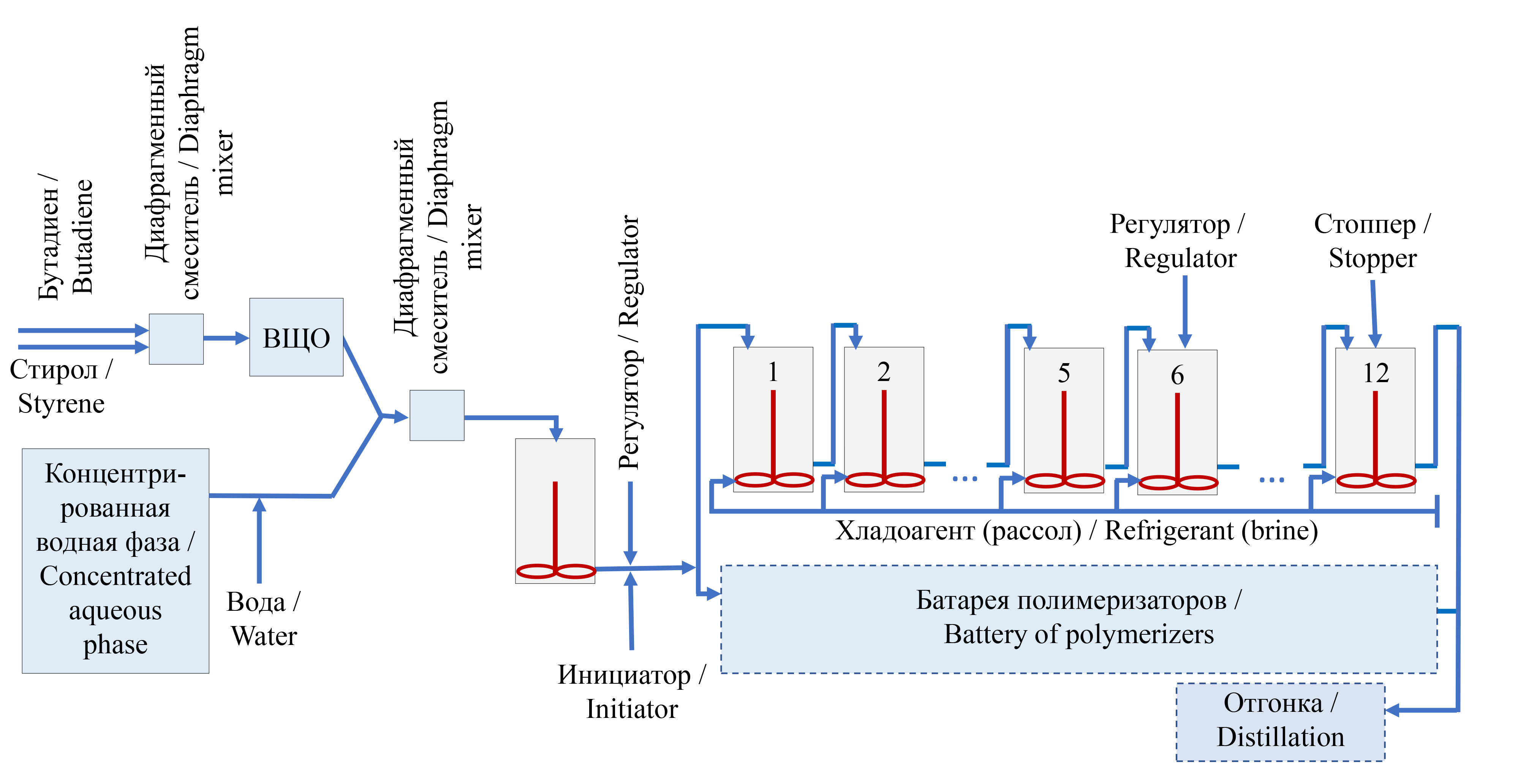 Для инициирования процесса используется гидроперекись пинана, объем которой эмпирически определяется под достижение конечной конверсии продукта. Для регулирования молекулярной массы применяется трет-додецилмеркаптан. В рамках существующего производства возможна как двух-, так и трехточечная подача регулятора. В непрерывном производстве задействовано до 12 реакторов объемом до 10,8 м3, а технология промышленного производства предполагает ввод регулятора в 1, 3 и 6-й по ходу батареи полимеризаторы (рис. 1). Соотношение бутадиена со стиролом в мономерной фазе по массовым частям составляет 70:30 и обеспечивает при достижении заданной конверсии характерные свойства продукта по составу.