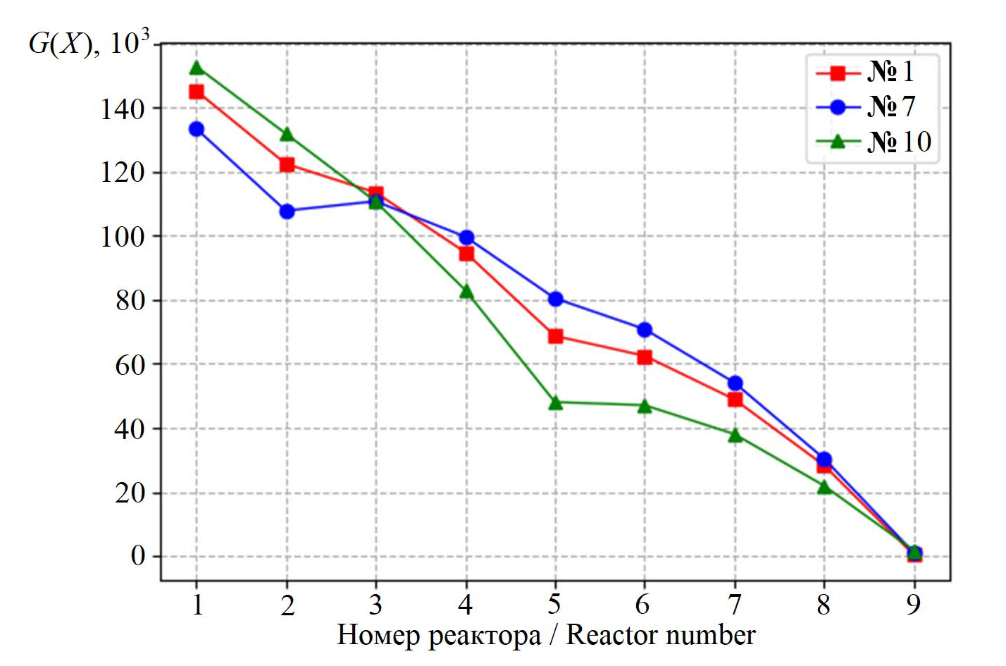 Рис. 3. Зависимость критерия оптимизации G(X) от номера полимеризатора для трех различных режимов подачи регулятора (№ 1, № 7 и № 10)