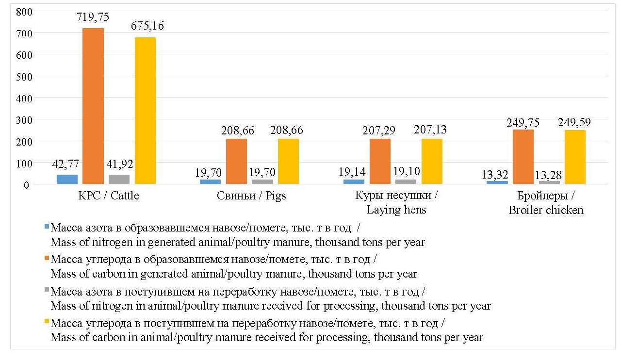 Fig. 1. Mass of nitrogen and carbon in animal/poultry manure generated in North-Western Federal District in 2022
