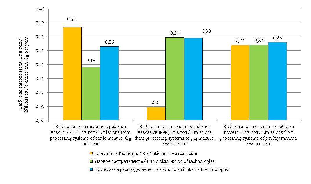 В результате расчетов для СЗФО установлено, что эмиссии метана и закиси азота в пересчете на CO2 эквивалент составили: по данным Кадастра 382,3 и 193,4 тыс. т (Гг) в год соответственно; по базовому распределению технологий 594 и 225,4 тыс. т (Гг) в год соответственно; по прогнозному распределению технологий 598,1 и 249,6 тыс. т (Гг) в год соответственно. Полученные значения говорят о том, что расчетные эмиссии при уточненном распределении технологий переработки навоза и помета увеличиваются на 35,6 % и 14,2 % для метана и закиси азота соответственно, по сравнению с укрупненным распределением, применяемым в Кадастре.