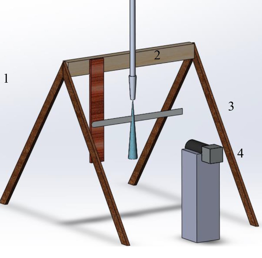 Рис. 1. Устройство стенда для измерения геометрических параметров струи воды: 1 – подставка; 2 – подающая магистраль аппарата высокого давления со сменными форсунками; 3 – стальная линейка; 4 – камера