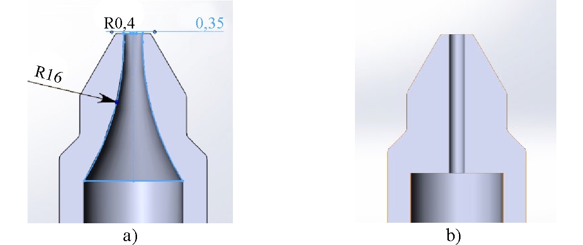 Рис. 3. Сечение форсунки турбо насадки разработанной конструкции (a), сечение форсунки стандартной турбо насадки (b)